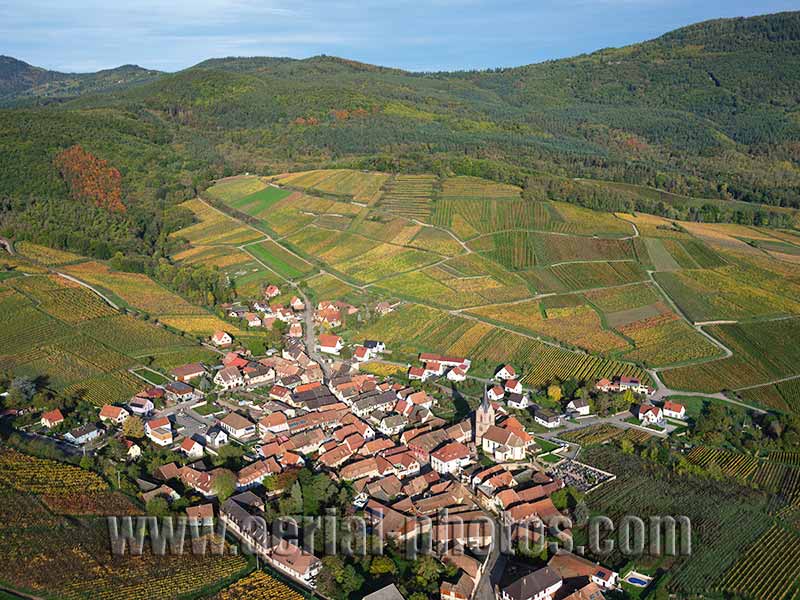Located at the foothills of the eastern Vosges Mountains in a landscape of vineyards, the village of Hunawihr is one of the five Alsatian villages labeled “one of the most beautiful villages of France.” The village is dominated by the Church of Saint-Jacques-le-Majeur. The church built in the 15th century is classified as a historic monument. In the distance, Saint-Ulrich Castle can be seen. Hunawihr, Haut-Rhin, Alsace, Grand Est, France.