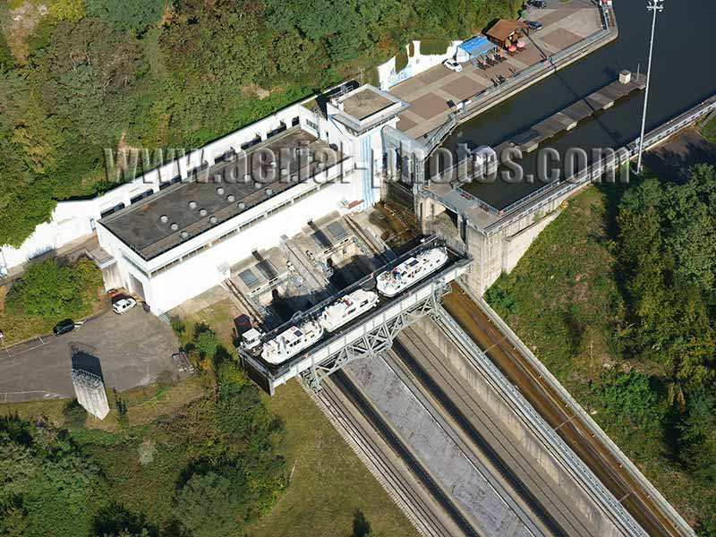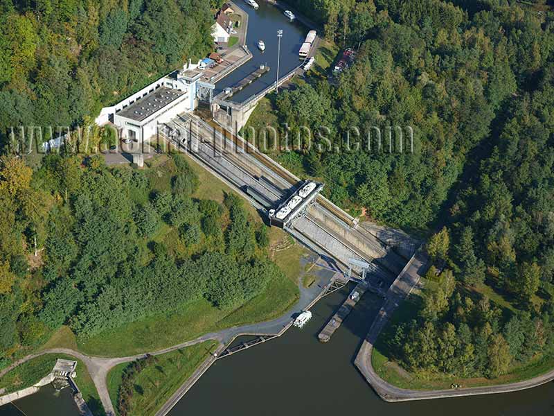 The historic Marne-Rhine Canal was opened in 1853, at a time when barges were not motorized yet but were hauled by horses or mules. It allowed to connect Paris (the Marne is an affluent of the Seine) with Alsace and Germany beyond. Crossing the steeper eastern Vosges Mountains involved going through 17 time-consuming locks. The inclined boat lift of Saint-Louis Arzviller was inaugurated in 1969, bypassing the 17 locks, thus reducing the travel time from an entire day down to around 20 minutes. Saint-Louis, Moselle, Grand Est, France.