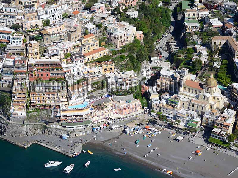The town of Positano, the beach and the historical Church of Santa Maria Assunta. Province of Salerno, Campania, Italy.