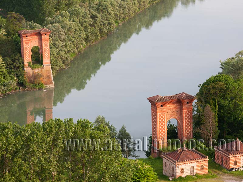 Moresco Bridge was a bridge across the Tanaro River, built under the reign of King Carlo Alberto in the mid-nineteenth century. Only the two pillars remain as the rope and wood span of the bridge was destroyed by partisans during World War II to prevent access to the city of Alba. Pollenzo, Province of Cuneo, Piedmont, Italy.