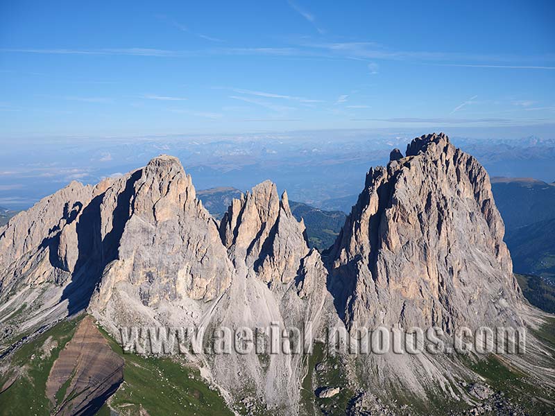 Langkofel Group (or Gruppo del Sassolungo in Italian) is a small massif in the western Dolomites. This view from the southeast shows three distinctive peaks with left to right; Sasso Levante, Punta dell Cinque Dita and Sassolungo (highest peak with an elevation of 3181 meters). Between the peaks of the Cinque Dita and the Sassolungo in a pass at an elevation of 2685 meters, a mountain hut is photogenically located in this stunning mineral world of ancient coral reefs. Province of Trentino, Trentino-Alto Adige, Italy.