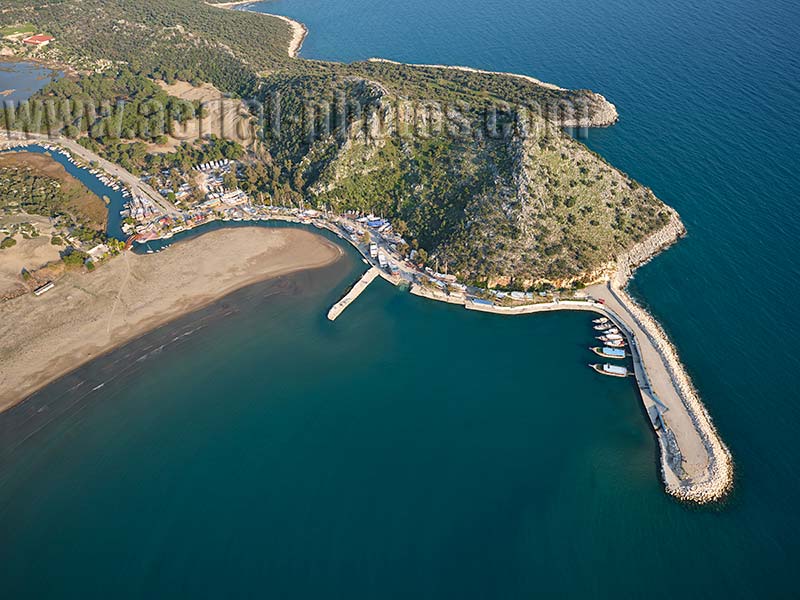 Rocky promontory of Büyükkum. In the upper left, the Ancient City of Andriake can be seen. It was Myra’s Andriake Port, a time in the Lycian era when the sea was further inland, now about 1 kilometer away. A shipyard is on the left bank of the channel. Demre, Antalya Province, Turkey.