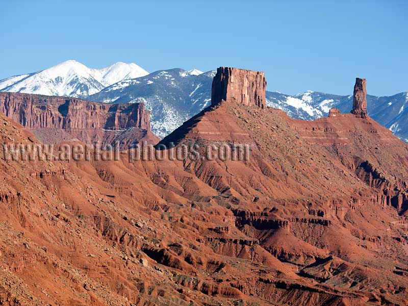 Desert Buttes and Alpine Peaks Combo. The varied Utahn landscapes are a bonanza for the film industry; the landscapes of many countries condensed into one single state. Castleton Tower and La Sal Mountains, Grand County, Utah, United States.
