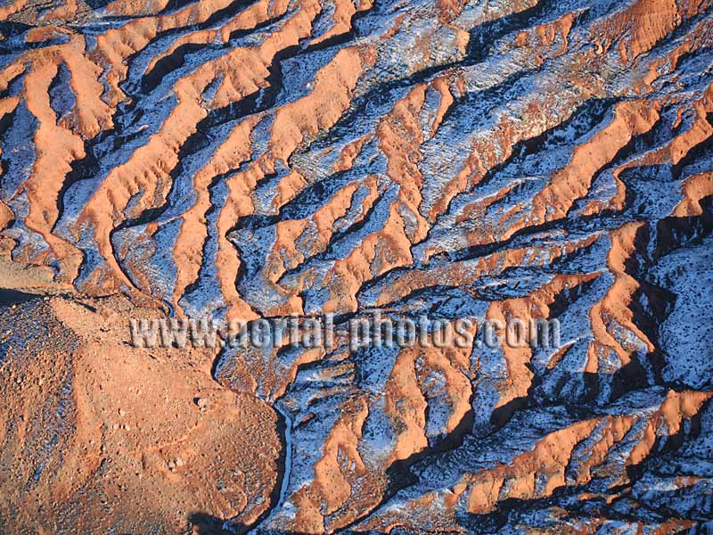 The area around the remote town of Caineville abounds with some of earth’s incredible abstract landscapes. This aerial shot resembles a banded agate gem seen at close range. Wayne County, Utah, United States.